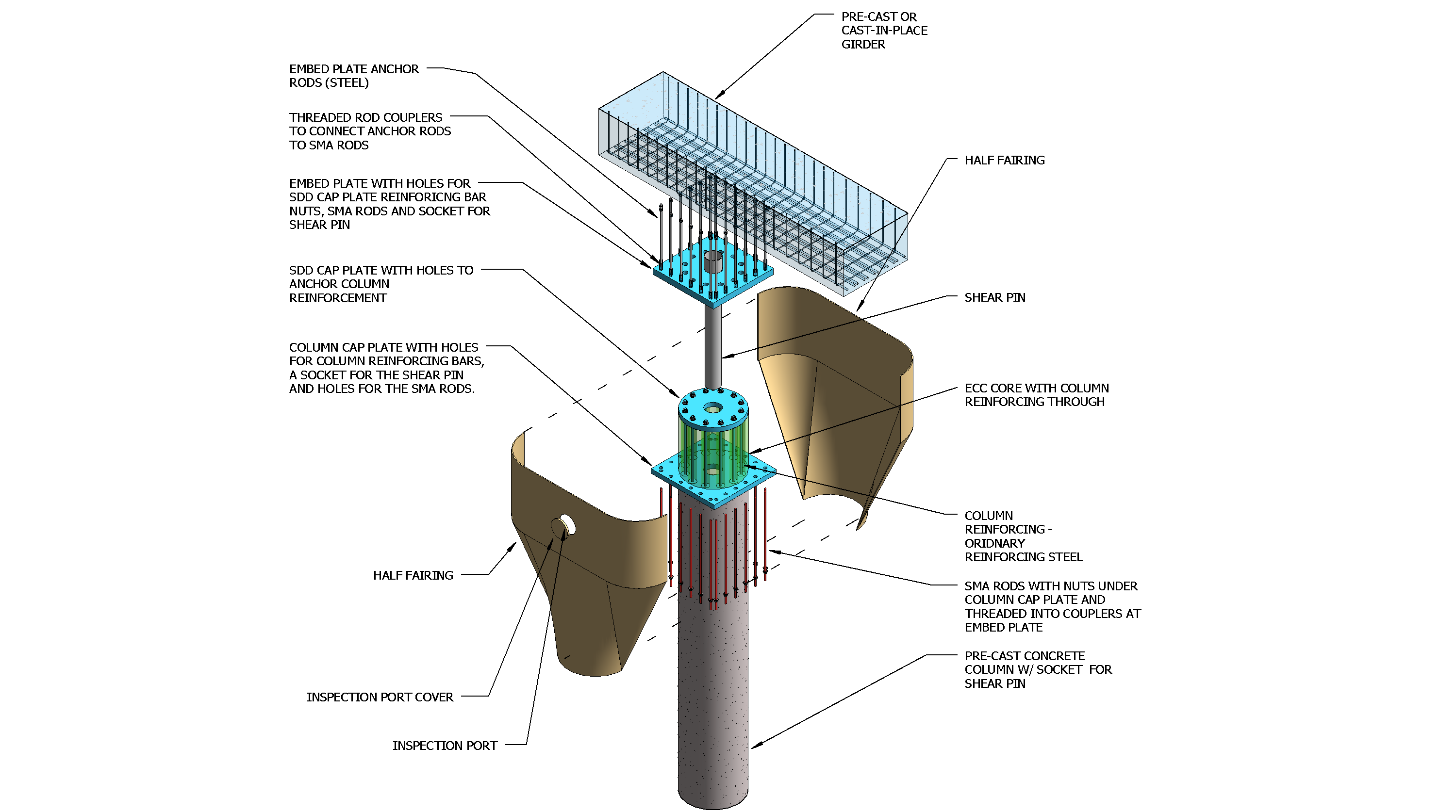 EXPLODED VIEW OF A BIAXIAL SDD ON A ROUND CONCRETE COLUMN SHOWING THE KEY COMPONENTS OF THE STRUCTURAL COMPONENT SYSTEMS RAPID COLUMN SYSTEM